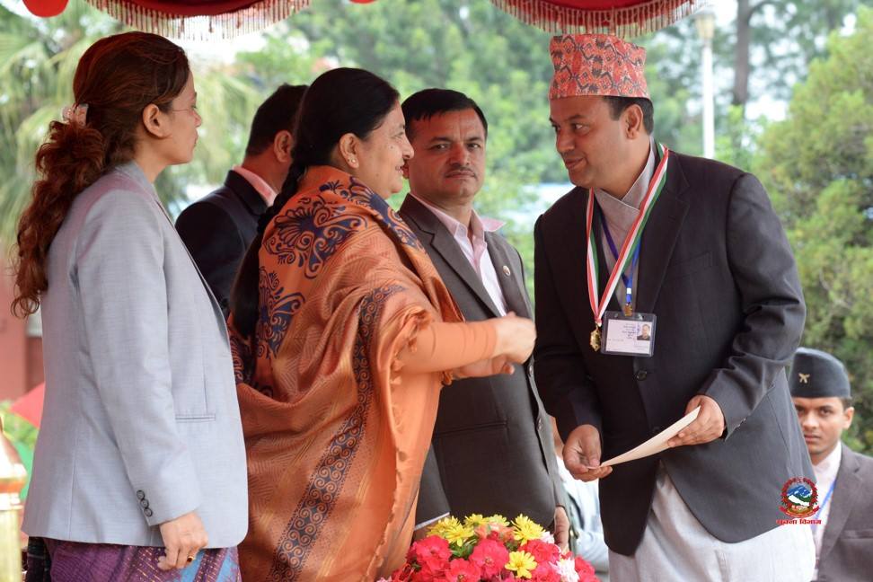 With the Nobel Laureate in Physics 1986, Prof Heinrich Rohrer, during his visit to the laboratory in NIMS, JapanHem Raj receiving a gold medal from the president of Nepal (Sept 2016)